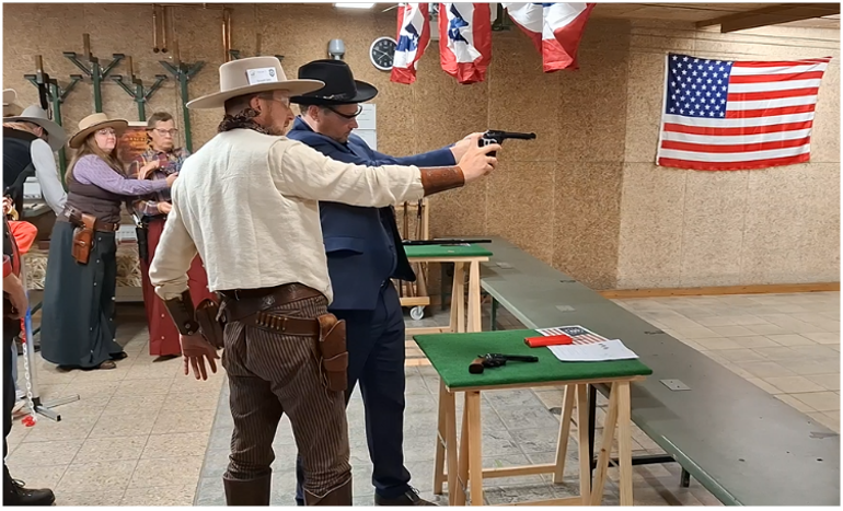 „SunSet Sam“, der das Cowboy Action Shooting mit CO₂ und Druckluftwaffen ins Leben gerufen hatte, freute sich sehr, dass er nun auch einen „Bürgermeister“ erklären durfte, wie das Laden der benötigten Druckluftwaffen funktioniert.