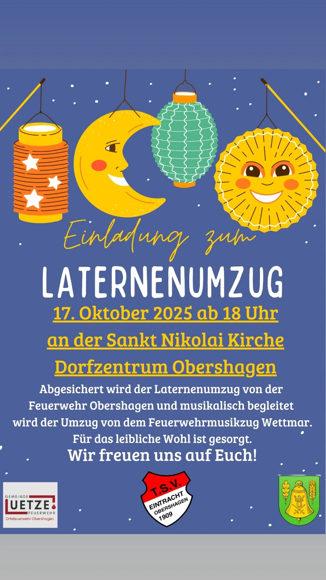 Am Freitag, 17. Oktober 2025, erstrahlt Obershagen wieder im Lichterglanz: Der traditionelle Laternenumzug startet um 18 Uhr an der Sankt-Nikolai-Kirche im Dorfzentrum. Begleitet vom Feuerwehrmusikzug Wettmar zieht der bunte Zug mit fröhlichen Kindern, leuchtenden Laternen und stimmungsvoller Musik durch die Straßen des Ortes.