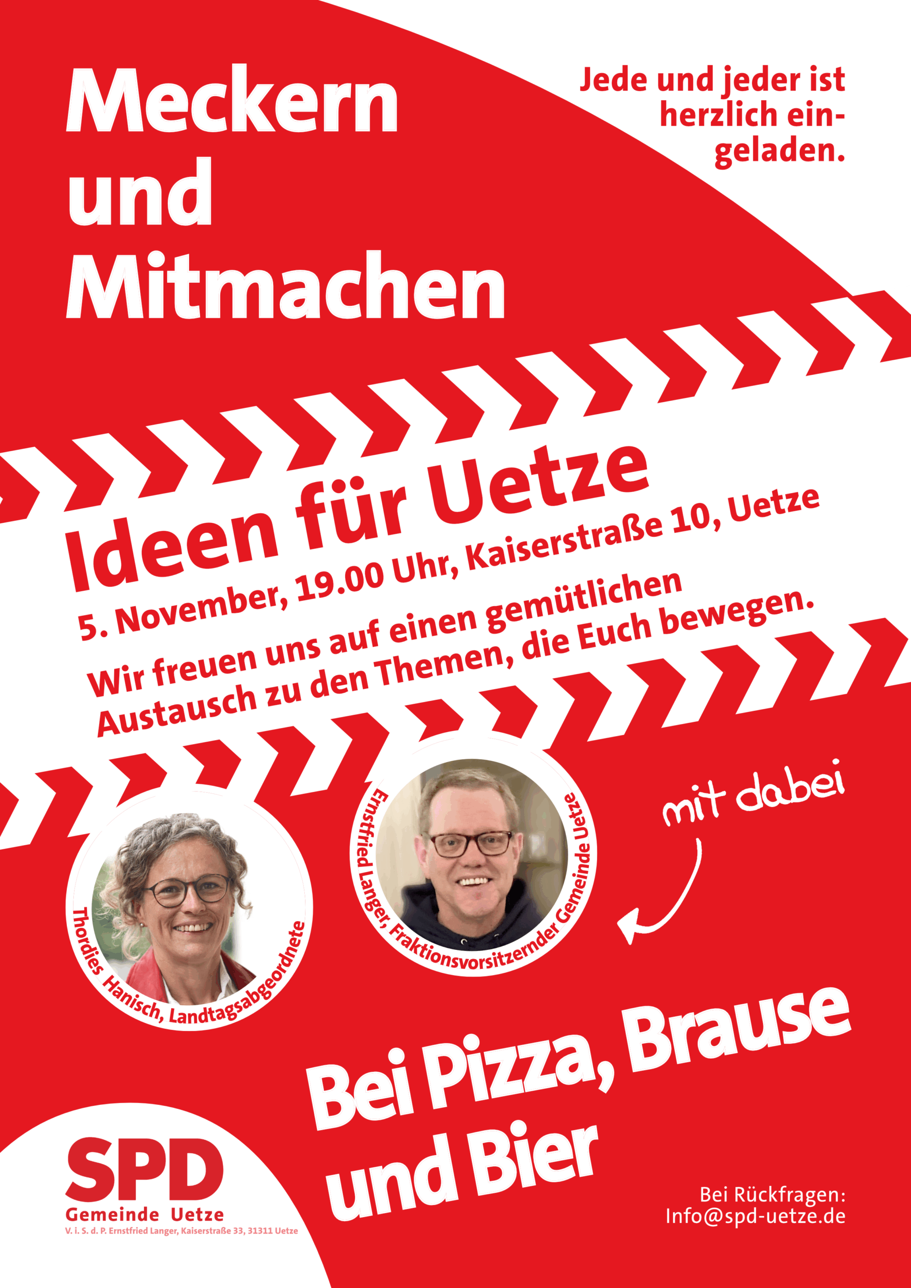 Unter dem Motto „Meckern und Mitmachen“ lädt die SPD Uetze am kommenden Mittwoch, 5. November 2025, um 19 Uhr zu einer offenen Gesprächsrunde in die Kaiserstraße 10 ein. Bei Pizza, Brause und Bier können Bürger in entspannter Atmosphäre über kommunalpolitische Themen sprechen, Ideen einbringen und Kritik äußern.