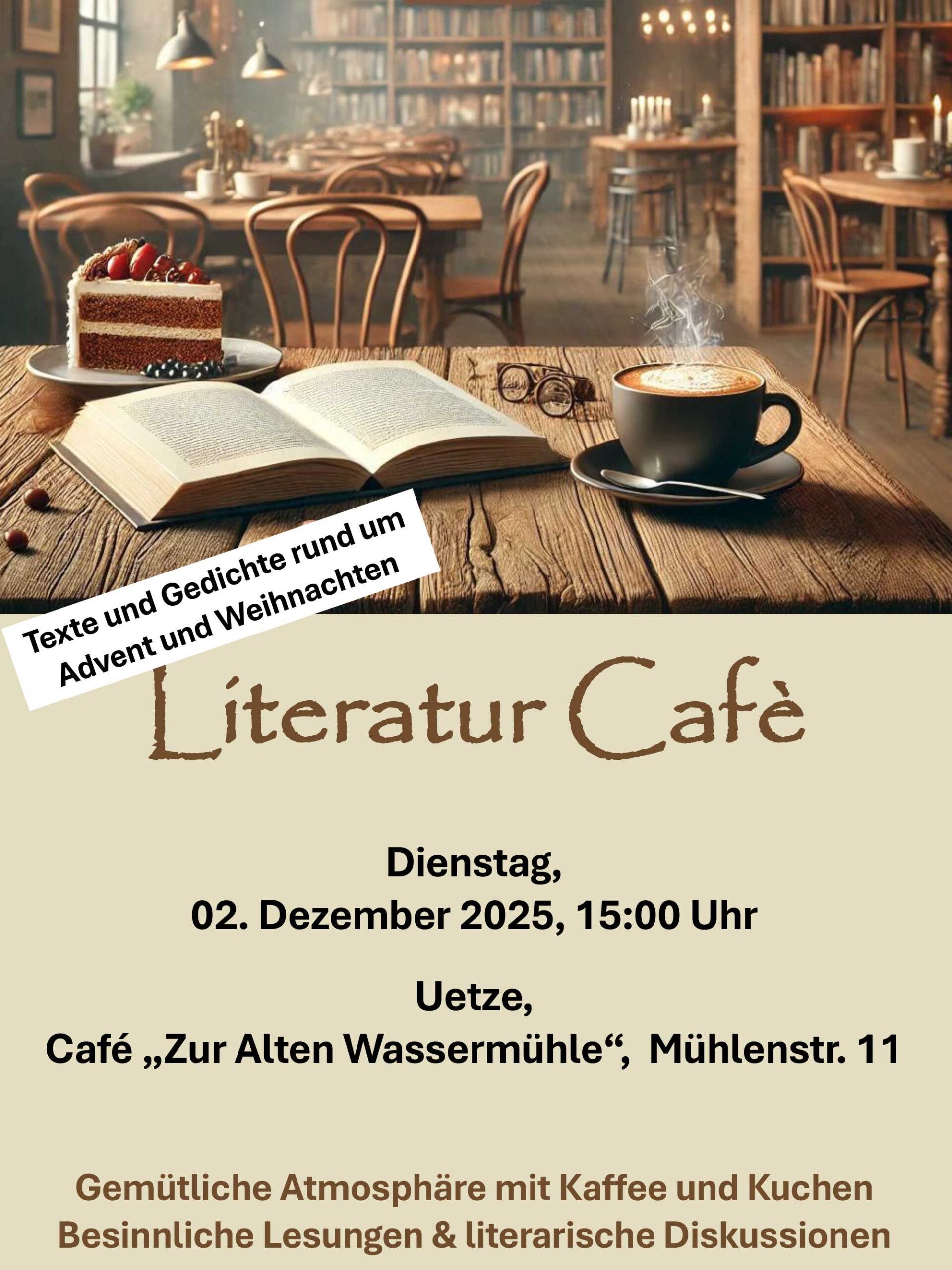 Wenn sich das Jahr dem Ende neigt, die Tage kürzer werden und der Duft von Zimt die Räume erfüllt, lädt das Literatur Café Uetze zu einem adventlichen Nachmittag in die Alte Wassermühle ein. Die Veranstaltung beginnt um 15 Uhr im Café „Zur Alten Wassermühle“ in der Mühlenstraße 11 in Uetze und steht ganz im Zeichen der stillen und zugleich stimmungsvollen Vorweihnachtszeit.