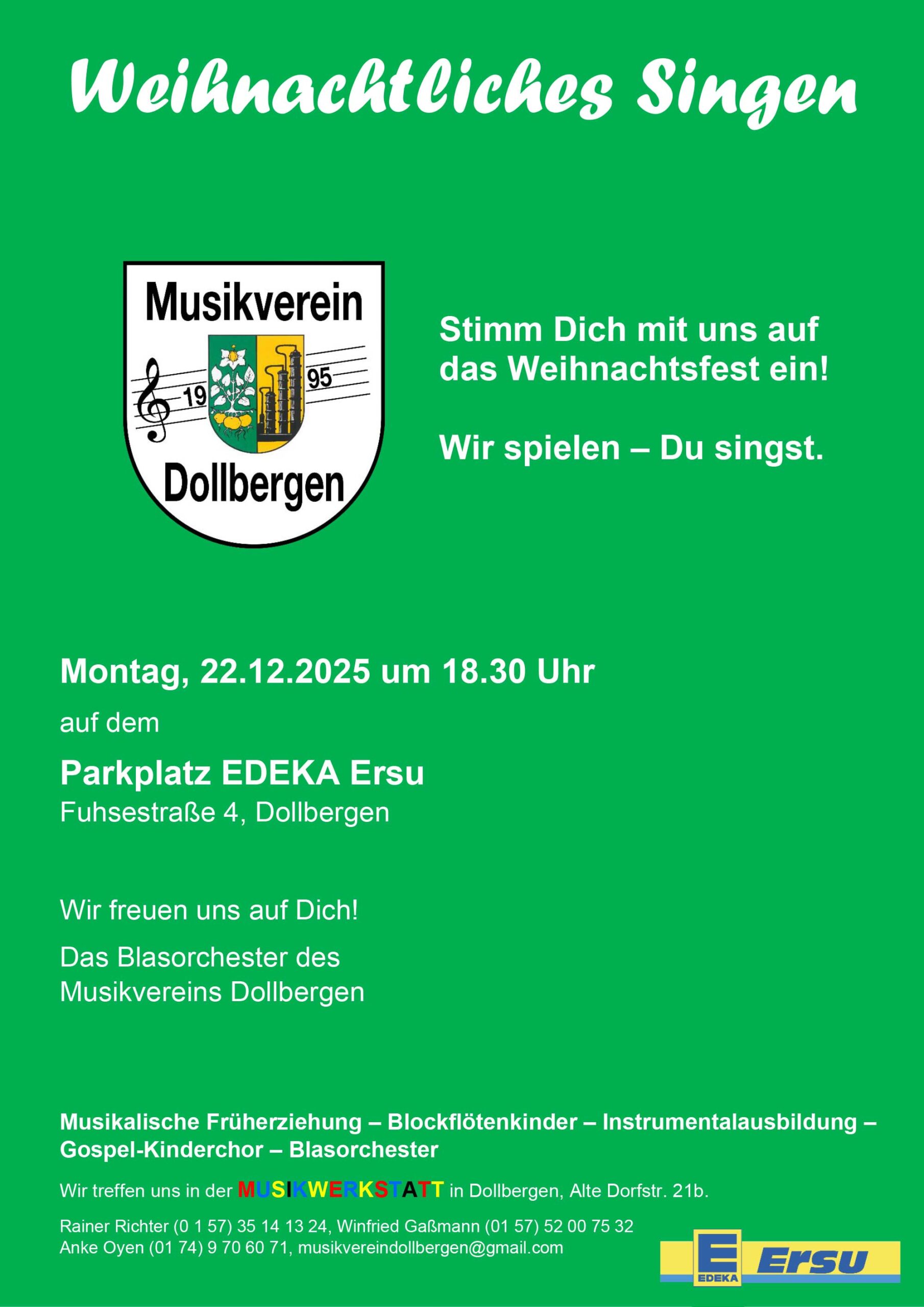 Am Montag, 22. Dezember 2025, findet um 18.30 Uhr auf dem Ersu-Parkplatz in Dollbergen erneut das gemeinschaftliche Weihnachtssingen statt. Bereits zum vierten Mal in Folge spielt das Blasorchester des Musikvereins traditionelle Weihnachtslieder, zu denen das Publikum ungezwungen dabeistehen und mitsingen kann.