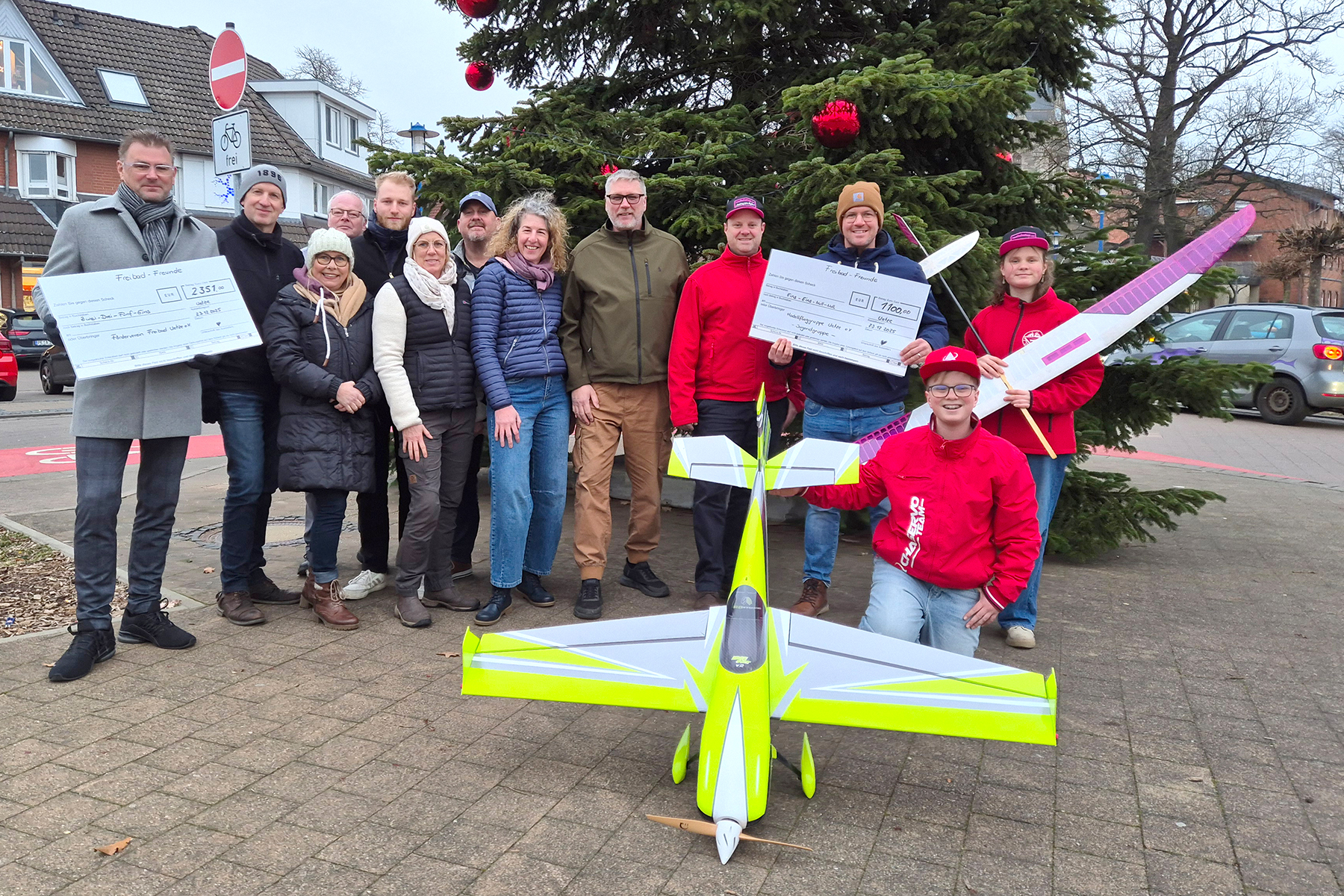 Michael Kropp (Mitte) und die Uetzer Freibadfreunde übergeben die Spenden-Schecks an Marco Heine (links, Förderverein Freibad Uetze) und Henning Strauß (4. von links) sowie Sebastian Brandes (3. von links, Modellfluggruppe Uetze).