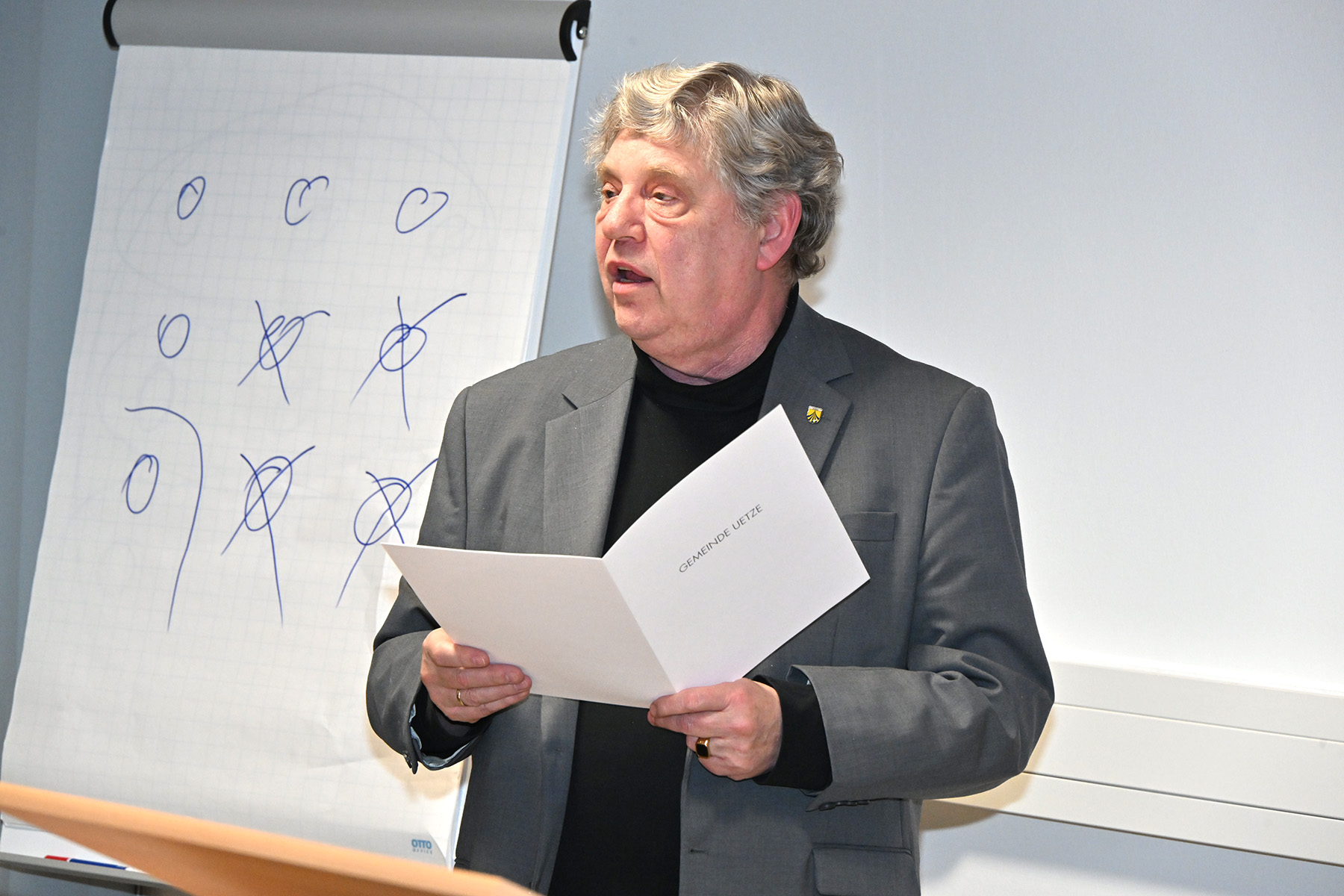 Den Kern seiner Rede bildete der Appell zur leistungsstarken Gemeindefeuerwehr. Von Grünhagen zeigte am Flipchart alle neun Ortsfeuerwehren auf. „Wir müssen über die Haltung innerhalb der neun Ortswehren sprechen“, betonte er und formulierte bewusst mit einer deutlichen Botschaft. „Zur Bildung einer leistungsstarken Gemeindefeuerwehr brauchen wir dieselbe Haltung.“