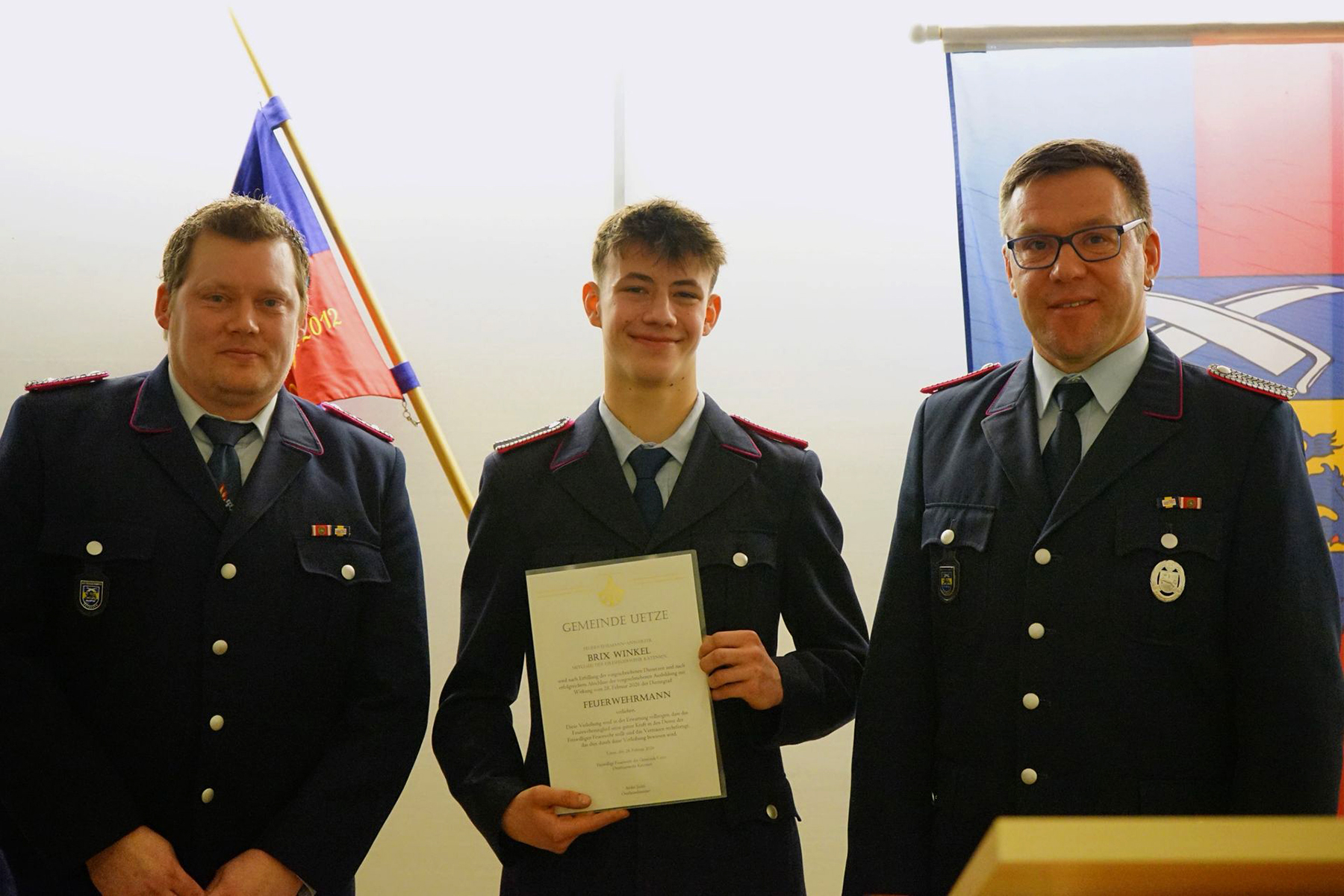 Im Rahmen der Versammlung wurden auch Beförderungen und Ehrungen vorgenommen. Nach seinem Feuerwehrgelöbnis wurde Brix Winkel zum Feuerwehrmann ernannt. Der stellvertretende Gemeindebrandmeister Sven Haase beförderte anschließend Patrick Naujok zum Hauptlöschmeister.