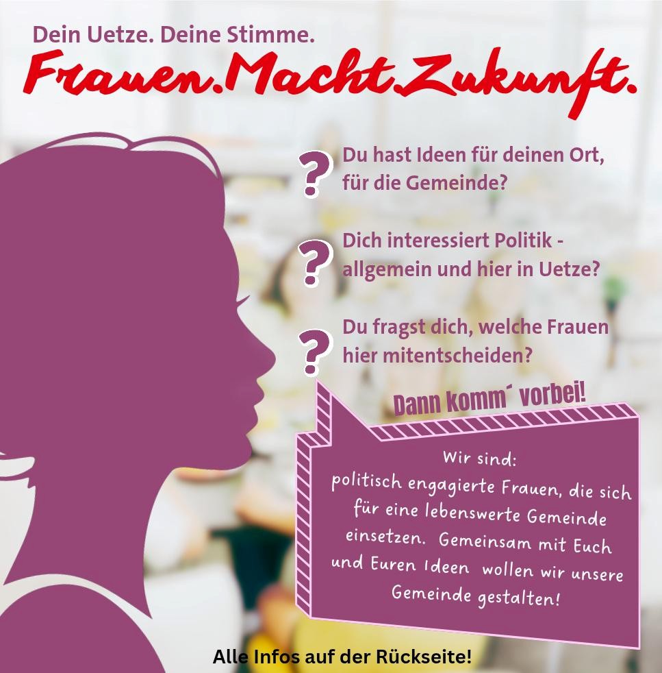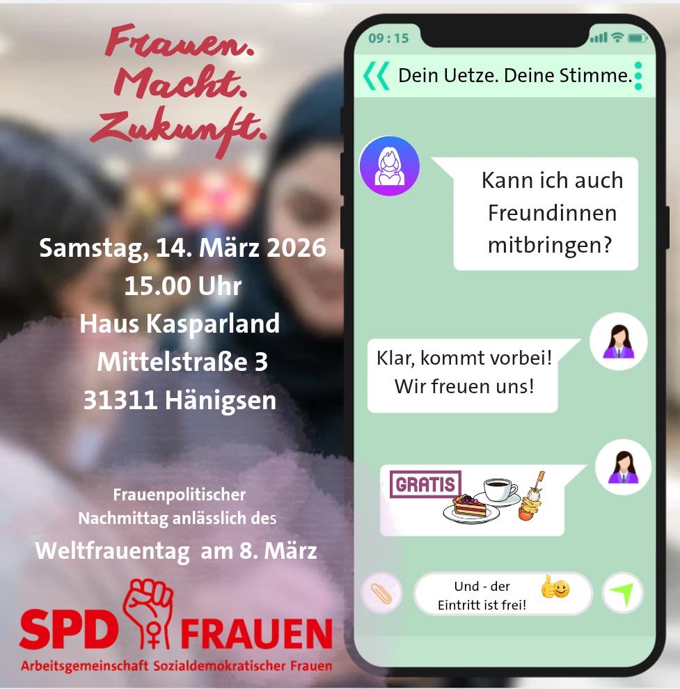 Die Frauen in der SPD Uetze laden anlässlich des Internationalen Frauentags zu einer Veranstaltung unter dem Titel „Frauen.Macht.Zukunft. – Dein Uetze. Deine Stimme.“ ein. Die Veranstaltung findet am Sonnabend, 14. März, um 15 Uhr im Haus Kasparland in Hänigsen statt.
