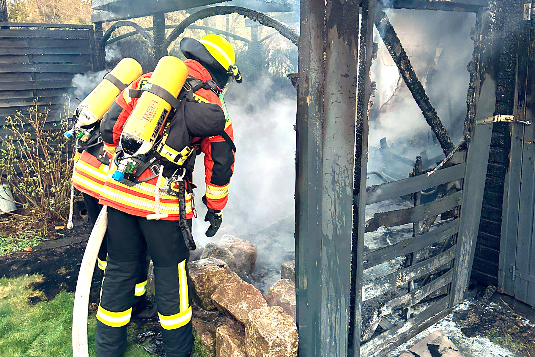 Am Einsatzort stellte sich heraus, dass ein hölzerner Gartenschuppen in Vollbrand stand. Zwei Anwohner hatten bereits versucht, die Flammen mit Gartenschläuchen und zwei Feuerlöschern zu bekämpfen.