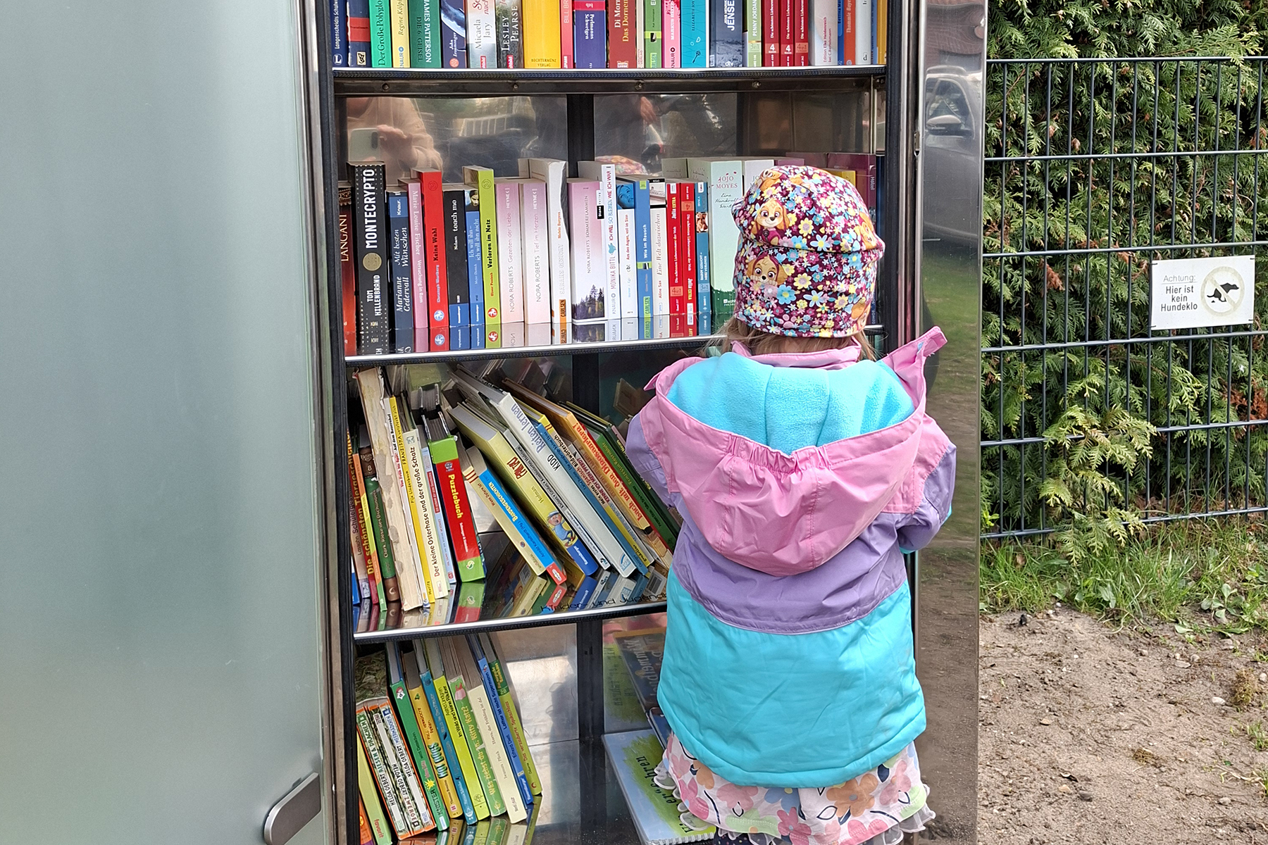 Hier kann sich frei bedienen, wer mag: Bücher mitnehmen, lesen, zurückbringen oder durch eigene Exemplare ergänzen. Der Bücherschrank lebt vom Mitmachen, vom Vertrauen und vom Teilen. Besonders hervorzuheben ist das separate, niedrig angelegte Fach für Kinder und Jugendliche. Auf Augenhöhe gestaltet, ermöglicht es schon den Jüngsten, ganz selbstverständlich erste Erfahrungen mit dem Prinzip des Teilens zu sammeln.
