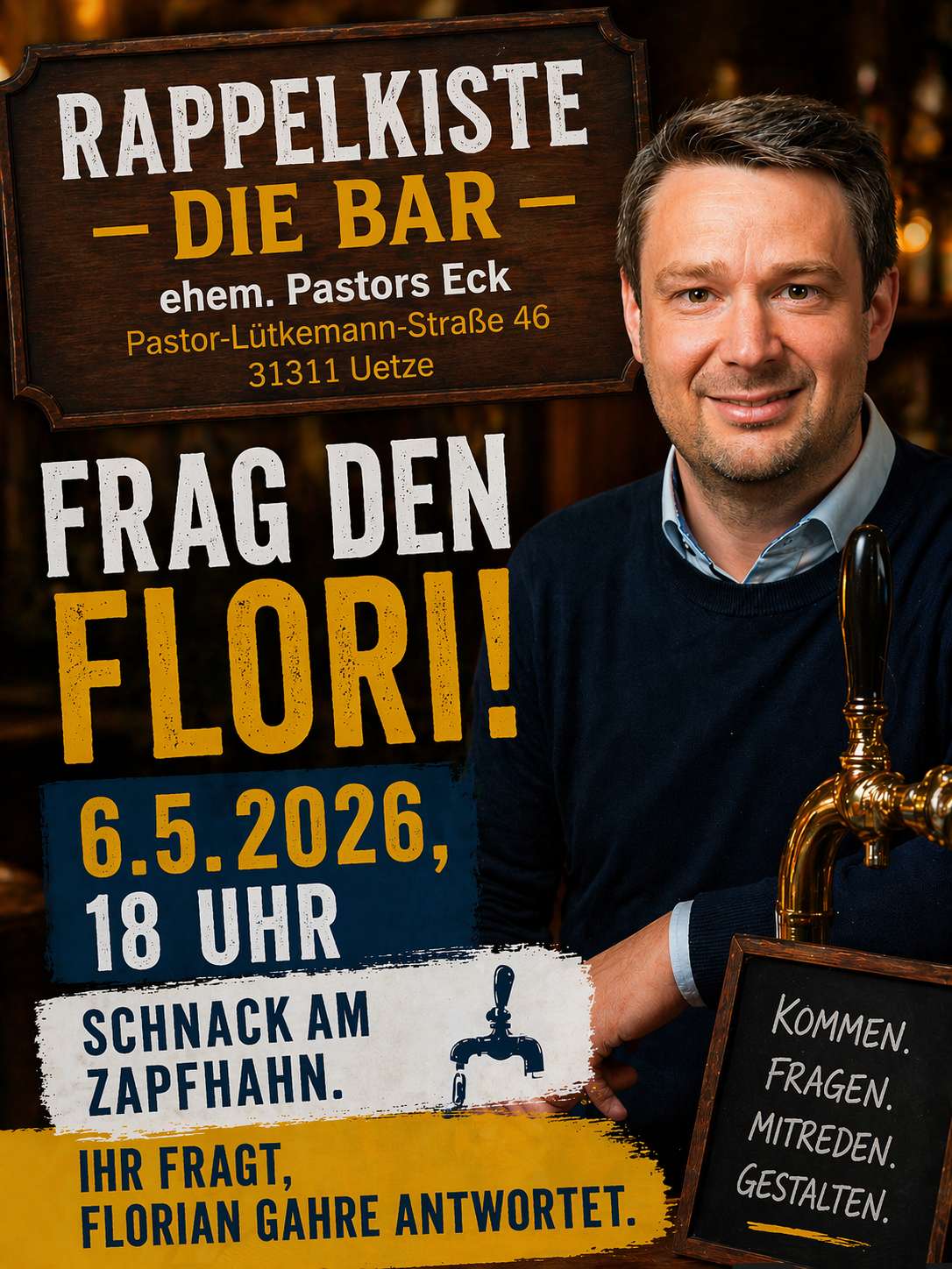 Utzes Bürgermeister Florian Gahre kommt am Mittwoch, 6. Mai 2026, als Privatperson in die Rappelkiste in Uetze, um mit Bürgern ins Gespräch zu kommen. Unter dem Motto „Frag den Flori“ beginnt die Veranstaltung um 18 Uhr in der Bar an der Pastor-Lütkemann-Straße 46, dem früheren Pastors Eck.